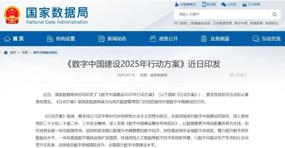 5月《行动方案》由国家数据局综合司印发,是国家数据局首次向地方数据管理部门印发的指导开展数字中国建设的文件。