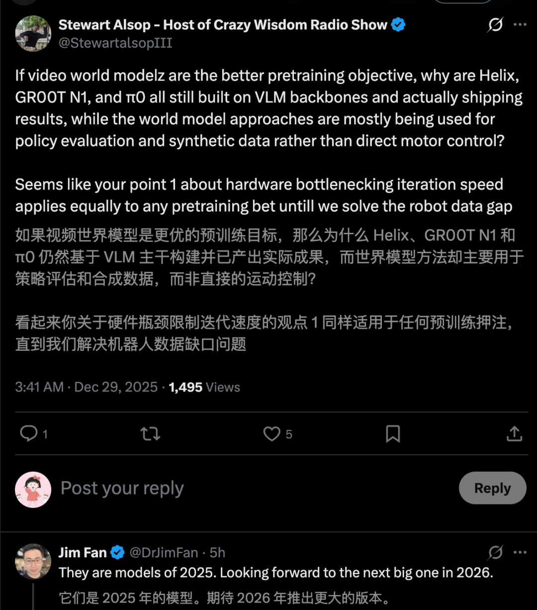 有网友反问道,如果说世界模型是更优的预训练目标,但当前主流模型仍基于VLM构建并产出实际成果,而世界模型却主要用于策略评估和合成数据,而非直接控制?