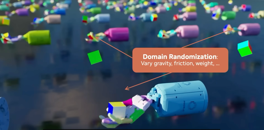 在仿真世界中,可以以1万倍于现实的速度训练,并通过「域随机化」(Domain Randomization)增强泛化能力。