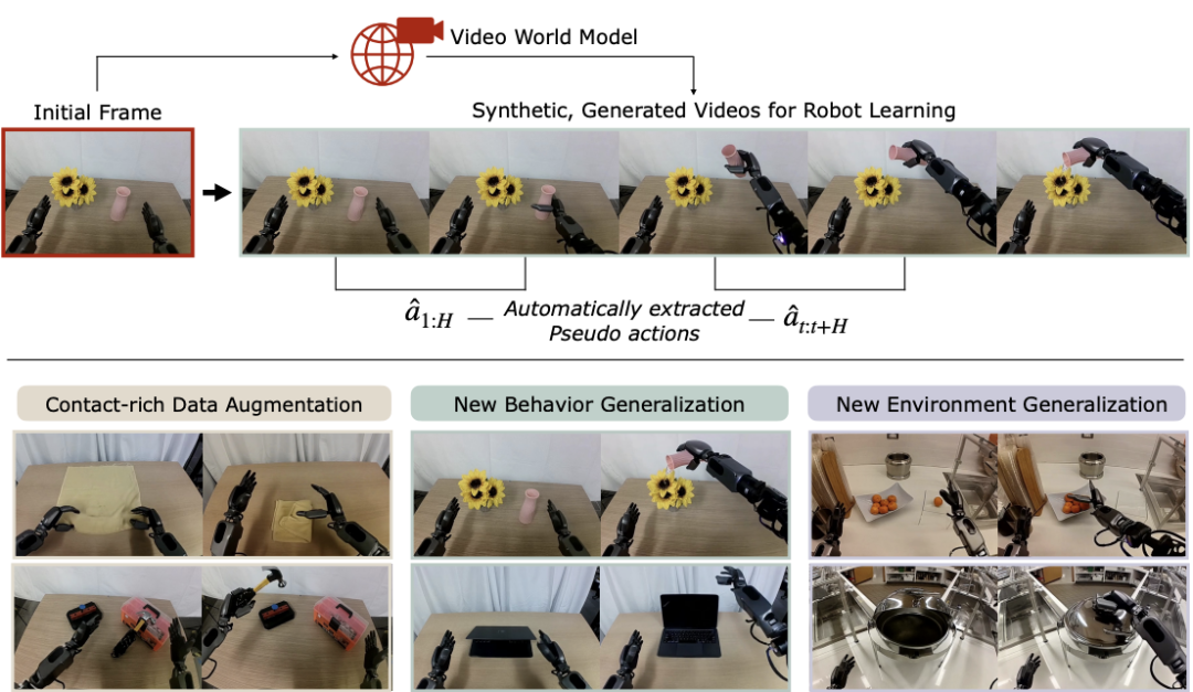 它通过「数字梦境」生成大量虚拟机器人行为,再从视频中提取动作数据,用于训练机器人策略,从而实现新任务和新环境中的泛化学习。