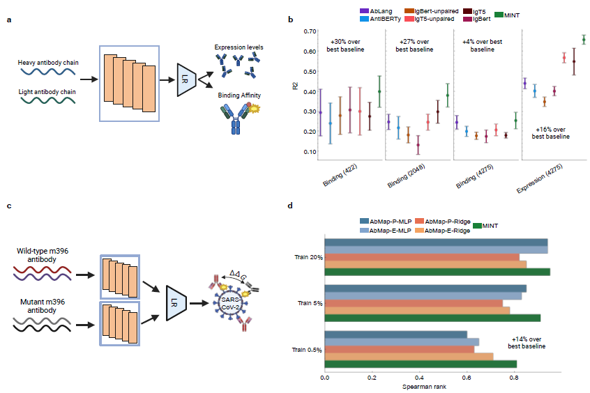 研究人员将 MINT 应用于抗体–抗原体系,联合建模重链与轻链序列。结果显示,MINT 在抗体结合亲和力和表达水平预测任务中优于抗体专用模型,尤其在训练样本极少的情况下仍保持较强性能,表明其具备良好的小样本泛化能力。