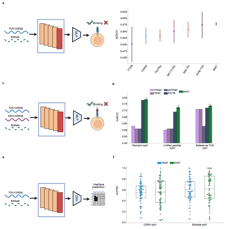 在 TCR–表位及 TCR–表位–MHC 相互作用预测任务中,MINT 仅需极少微调即可达到或超过现有方法。该结果表明,MINT 学到的多蛋白序列表示具有高度可迁移性,能够适配不同类型的免疫相关相互作用任务。