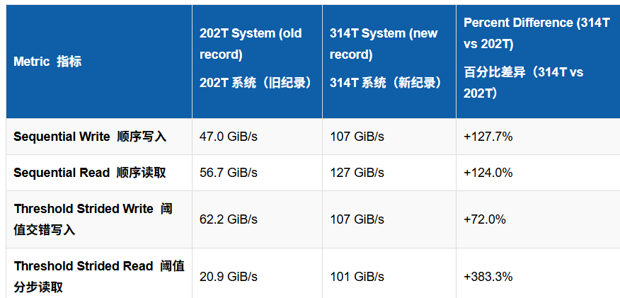 计算过程中,在存储调度时,部署 40 块 Gen5 NVMe SSD,其中 34 块用于计算中间结果,共提供约 2.1PB 空间;剩余 6 块构建 RAID10 用于最终 π 结果落盘。顺序读写性能翻倍,部分场景提升最高达 383%。
