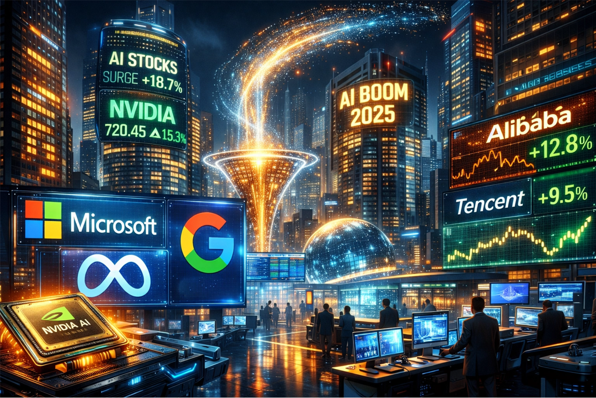 以美国市场为例,NVIDIA 在 2025 年股价屡创新高,反映出投资者对其 AI 芯片业务的追捧;微软、谷歌和 Meta 等公司虽然整体表现强劲,但涨幅呈现结构性差异,部分板块调整压力加大。在中国市场,阿里巴巴股价在年内触及多年高点,腾讯、百度等 AI 相关股票亦表现活跃,显示出市场对 AI 应用与基础设施国产化的持续关注。整体来看,全球资本市场对 AI 产业的定价仍维持在较高估值区间,这一背景也成为当前「AI 泡沫」讨论的重要前提。