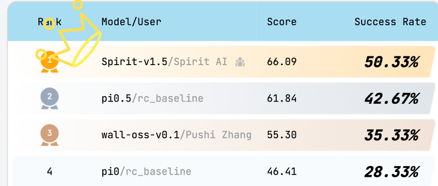 而现在,Spirit v1.5直接越过Pi0.5,拿下榜首。