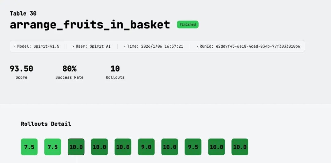 在水果入篮任务中,Spirit v1.5更是以80%的成功率,领先Pi0.5整整一倍。
