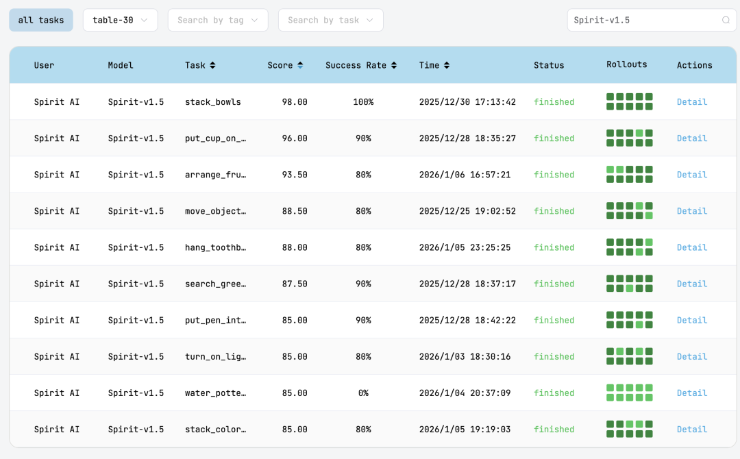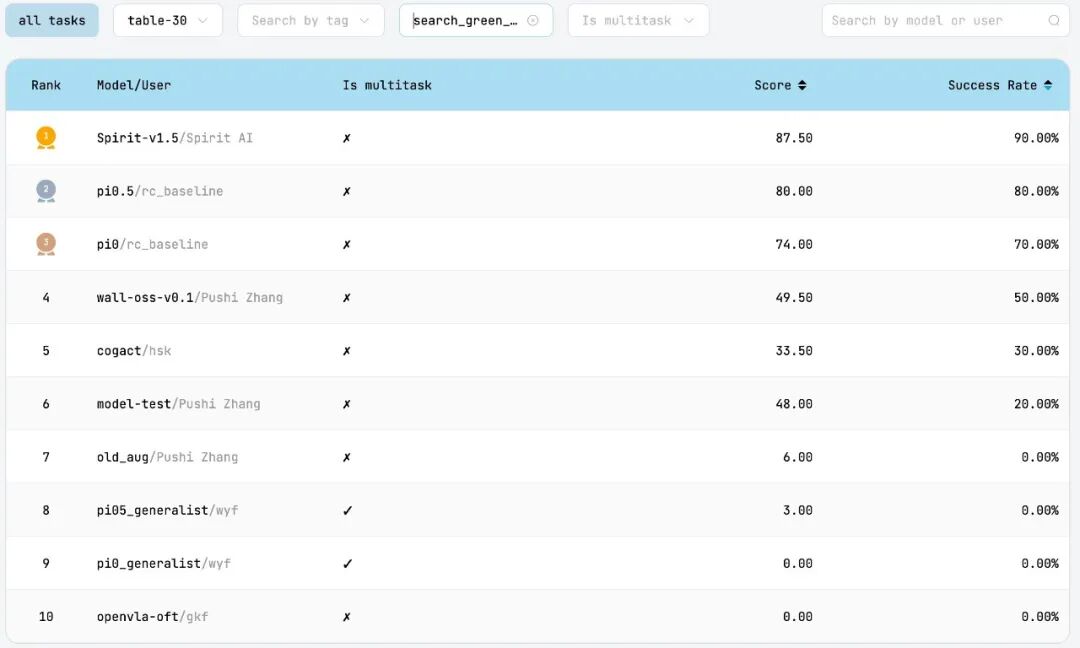 而这次Spirit v1.5在RoboChallenge上的登顶,并不仅仅意味着一次榜单上的领先。