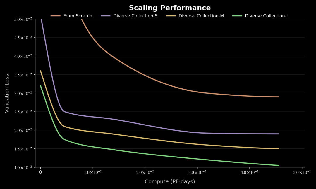 进一步扩大多样化数据规模后,模型的验证误差仍在持续下降,并未出现明显的早期饱和现象。