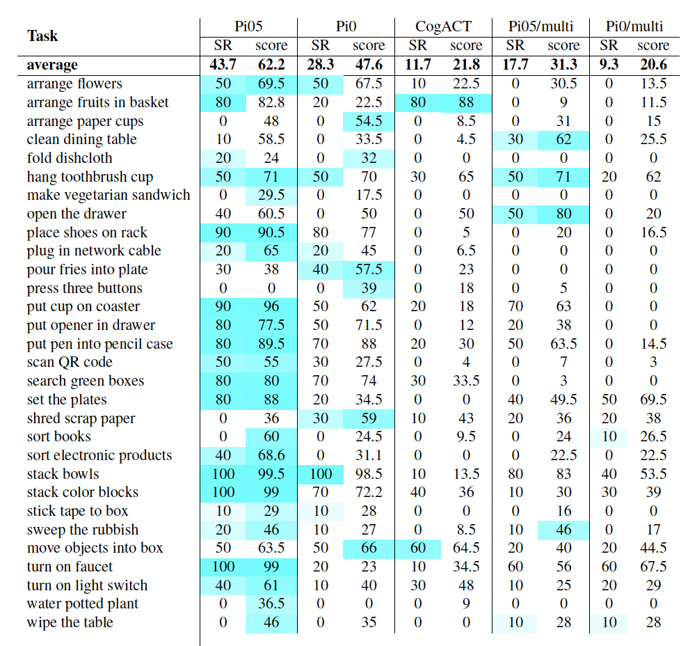还在贴胶带(stick tape to box)、清扫垃圾(sweep the rubbish)、开关灯(turn on light switch)等任务上实现绝对领先。