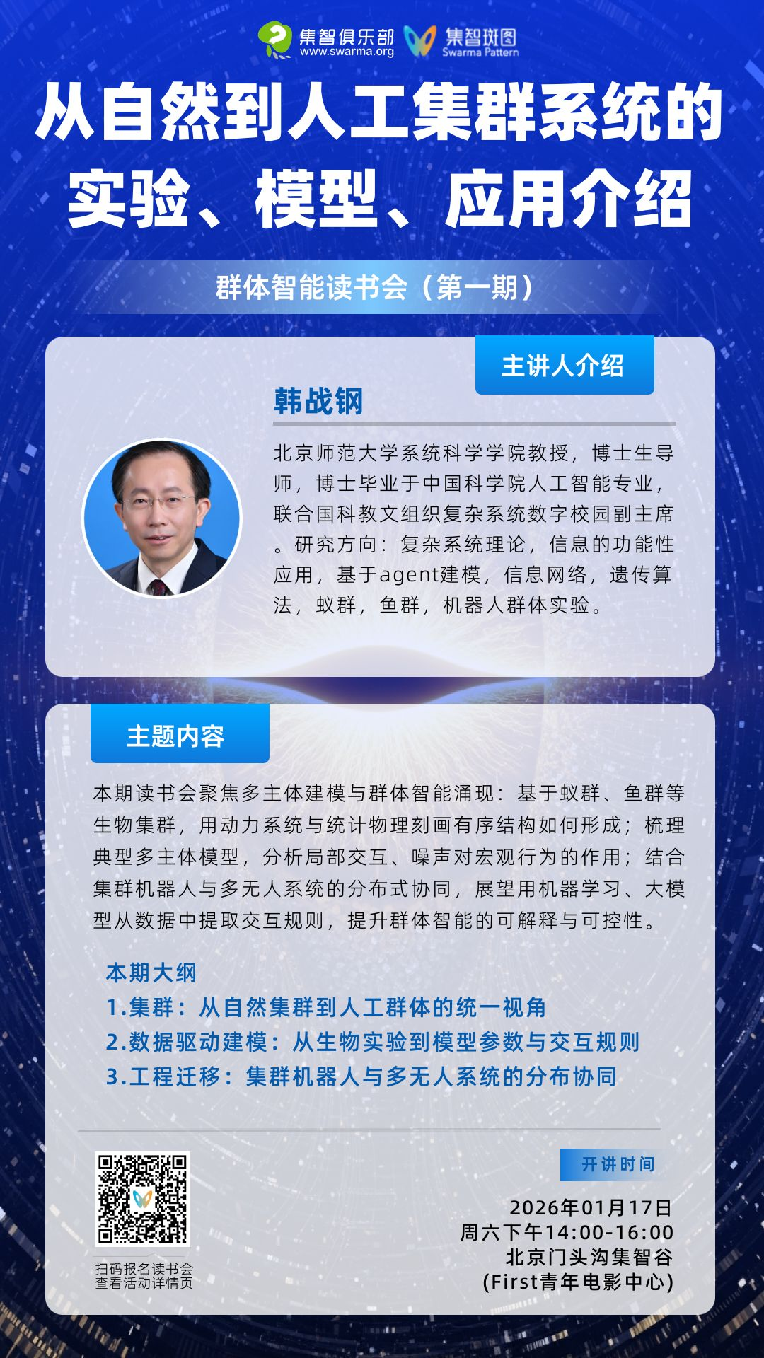 本期群体智能读书会将由北京师范大学系统科学学院韩战钢教授主讲,于2026年1月17日下午14:00-16:00北京门头沟集智谷(First青年电影中心)线下进行,有意线下参会的集智学员可在报名本期读书会,加入学员群后获得线下参会资格。