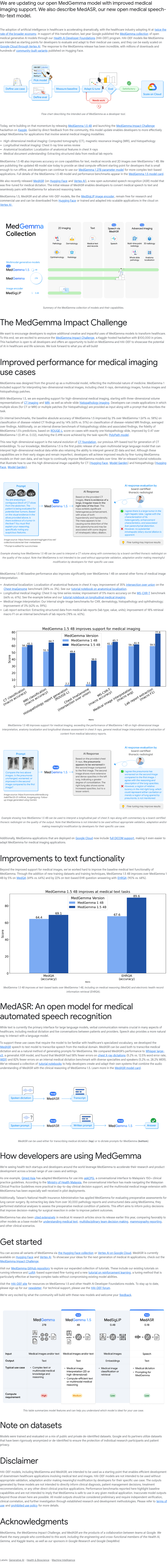 We are updating our open MedGemma model with improved medical imaging support. We also describe MedASR, our new open medical speech-to-text model. The adoption of artificial intelligence in healthcare is accelerating dramatically, with the healthcare industry adopting AI at twice the rate of the broader economy. In support of this transformation, last year Google published the MedGemma collection of open medical generative AI models through our Health AI Developer Foundations (HAI-DEF) program. HAI-DEF models like MedGemma are intended as starting points for developers to evaluate and adapt to their medical use cases, and they can be easily scaled on Google Cloud through Vertex AI. The response to the MedGemma release has been incredible, with millions of downloads and hundreds of community-built variants published on Hugging Face. Flow chart describing the intended use of MedGemma as a developer tool. Today, we’re building on that momentum by releasing MedGemma 1.5 4B and launching