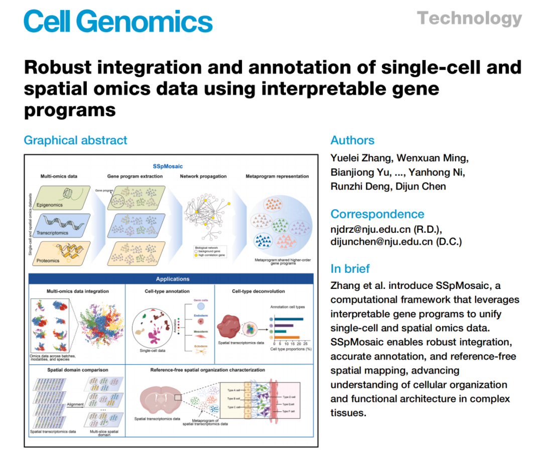 近日,南京大学陈迪俊团队在《Cell Genomics》上发表重要研究成果,首创一种名为SSpMosaic的计算框架,首次引入“元模块(metaprograms)”作为生物学通用锚点,打通了单细胞与空间多组学数据的整合、注释与空间解析全流程,为复杂组织与疾病微环境研究提供了强大、统一且可解释的分析工具。