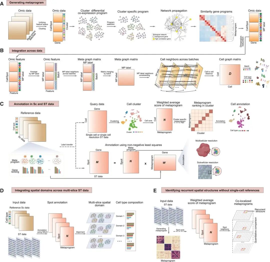 SSpMosaic 的核心是从不同数据集中提取基因共表达或共调控模块,并通过网络传播与层次聚类方法,将其融合为跨样本保守的“元模块”。这些元模块如同细胞状态与功能的“分子指纹”,为后续所有分析任务提供了稳定且可解释的锚点。基于这一基础,SSpMosaic 实现了多模态数据整合、高精度细胞注释、跨分辨率空间解卷积、多组学动态解析,乃至在无单细胞参考情况下的空间结构识别(图1)。