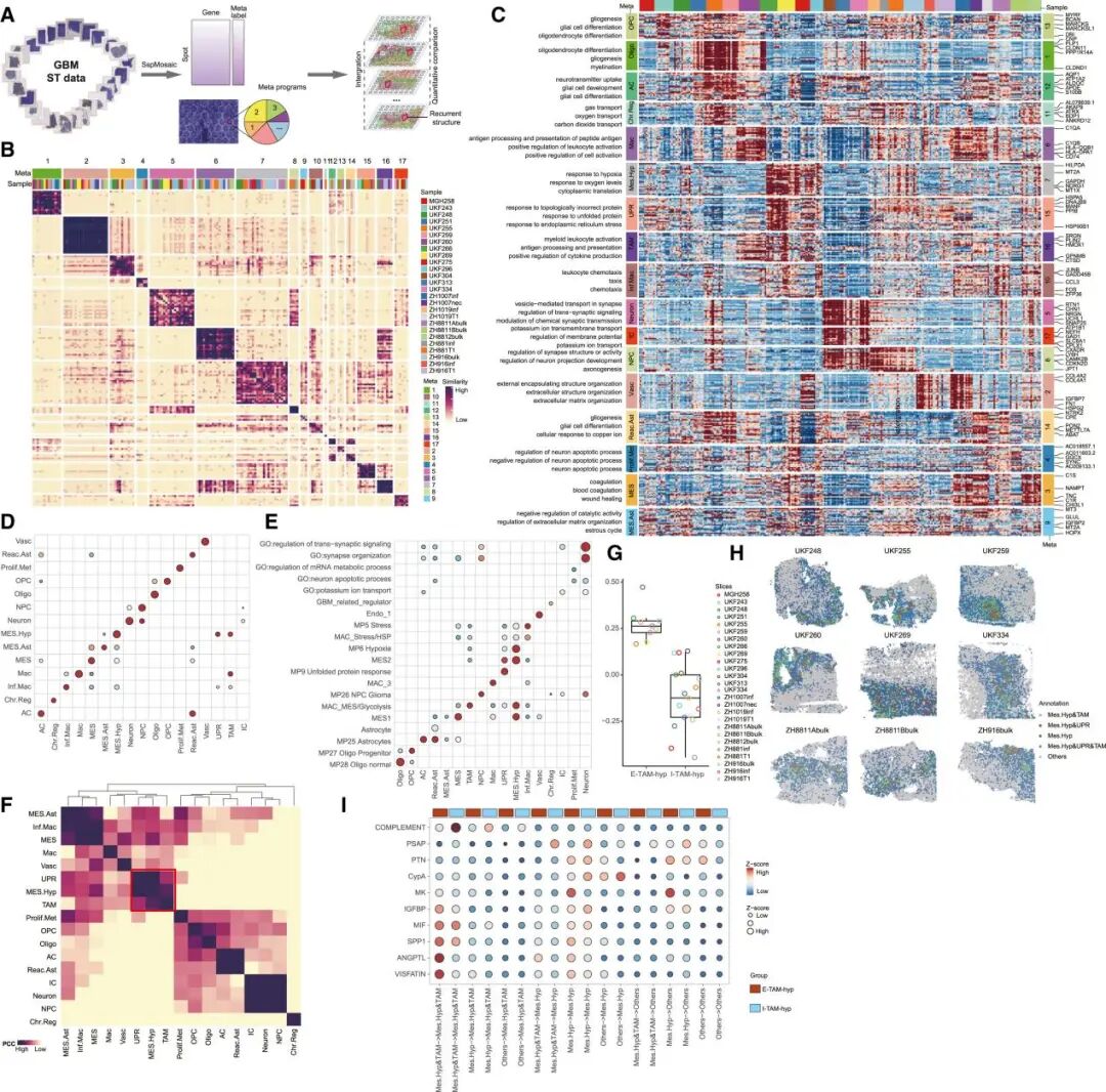 更具创新性的是,SSpMosaic 能够在无配对单细胞数据的情况下,直接对空间转录组进行解析(图2)。在 26 张胶质母细胞瘤切片的分析中,该框架自主推断出 17 个元模块,不仅覆盖已知细胞状态,还识别出如未折叠蛋白反应等新程序。通过新提出的“包裹指数”,研究量化了肿瘤相关巨噬细胞被缺氧区域包裹的空间结构,并揭示了相关信号通路的调控作用。