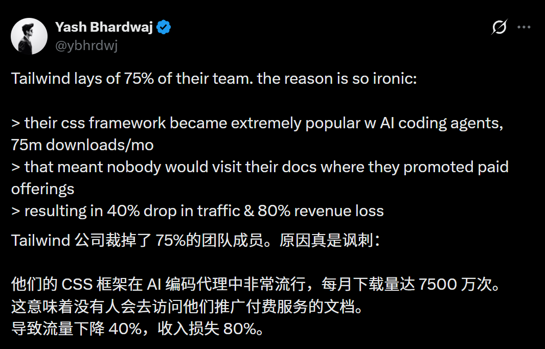 Tailwind的遭遇,并不是孤例。它只是第一个被AI的车轮正面碾碎的基础设施项目。