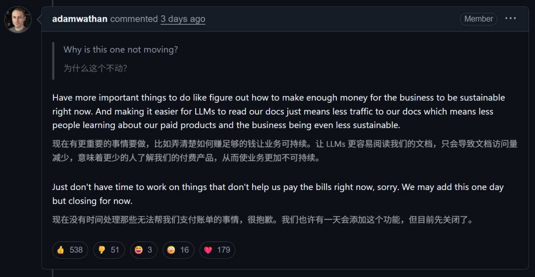 在Tailwind仓库里,有人提交了一个PR,却处于停滞状态。CEO回复说:我们现在必须赚钱,没有经历干其他的事