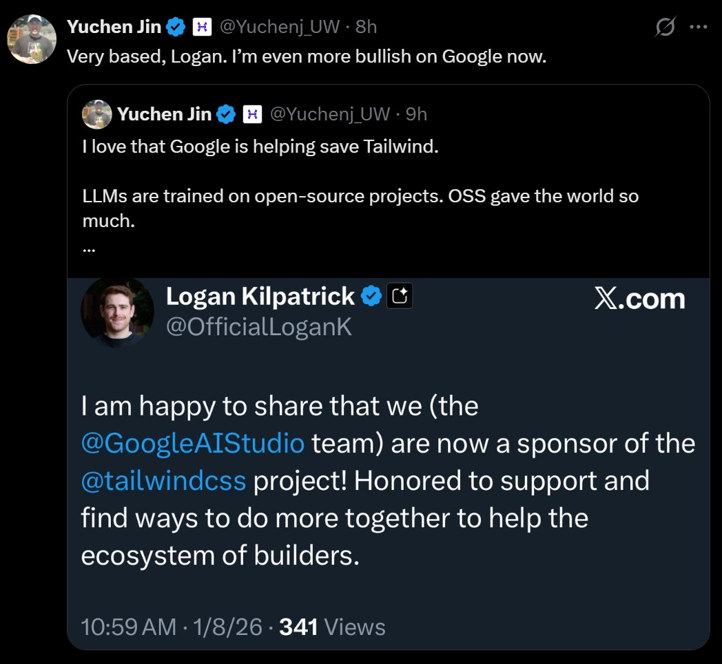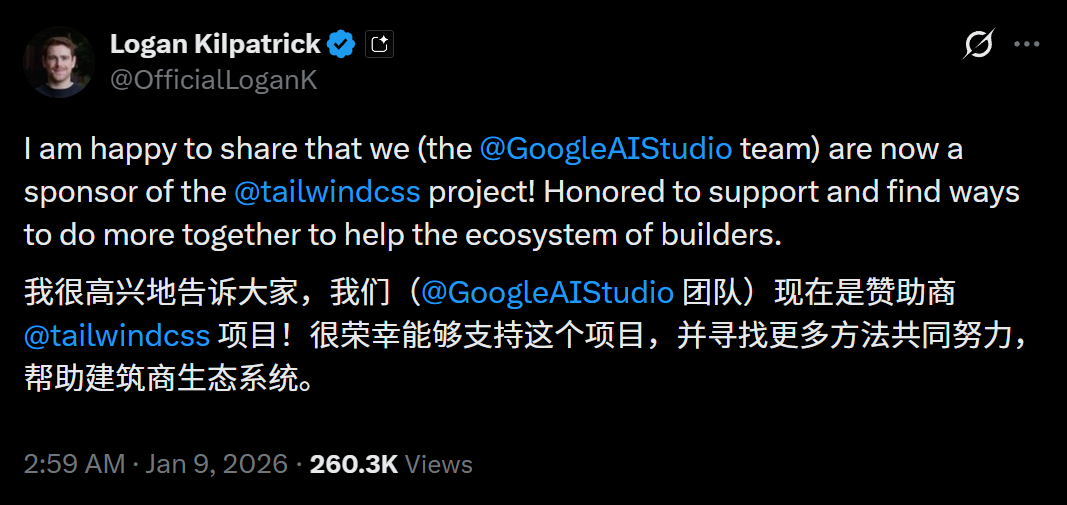 首先,Google AI Studio宣布:我们将成为Tailwind CSS项目的赞助商!