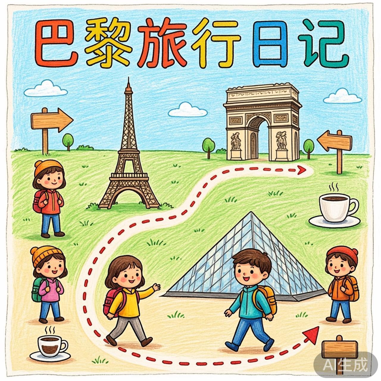 Prompt: 请创作一幅色彩鲜艳、充满童趣的蜡笔风格竖幅插画(9:16),标题为"巴黎旅行日记"。由一位好奇的孩子用彩色蜡笔绘制,主要场景为旅行日记风格的路线图,蜿蜒曲折的旅行路线连接多个地点(埃菲尔铁塔、卢浮宫等)。