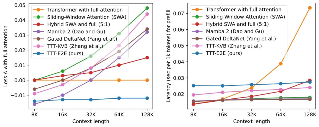 在3B参数模型的测试中,TTT-E2E在128K上下文长度下的测试损失与全注意力Transformer持平甚至更优,而Mamba 2、Gated DeltaNet等同类模型在长文本场景下性能均出现明显下滑;