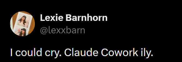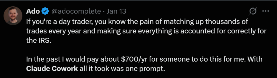 他表示:Claude Cowork简直不可思议,它重新整理了我所有的下载文件,为我的会议准备好了笔记,还把我的收据都分类归档好了。