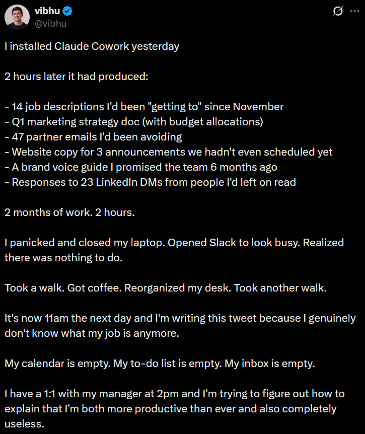 Claude Cowork上线第二天,网友彻底陷入存在主义恐慌!