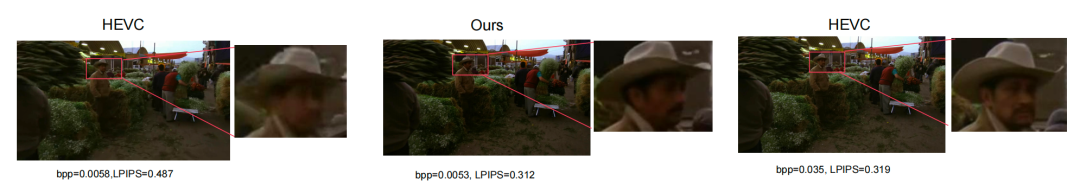 在极低码率下(0.005 bpp左右),使用LPIPS(一种更符合人类视觉感知的画质评价指标)进行对比: