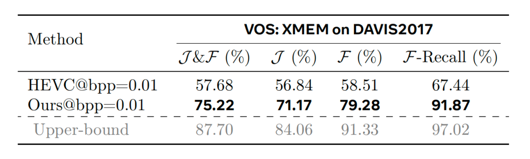 为此,团队在DAVIS2017视频分割任务上进行了验证;结果显示,在bpp=0.01的极限压缩下,GVC重建视频的J&F指标(衡量分割准确度)显著高于HEVC。