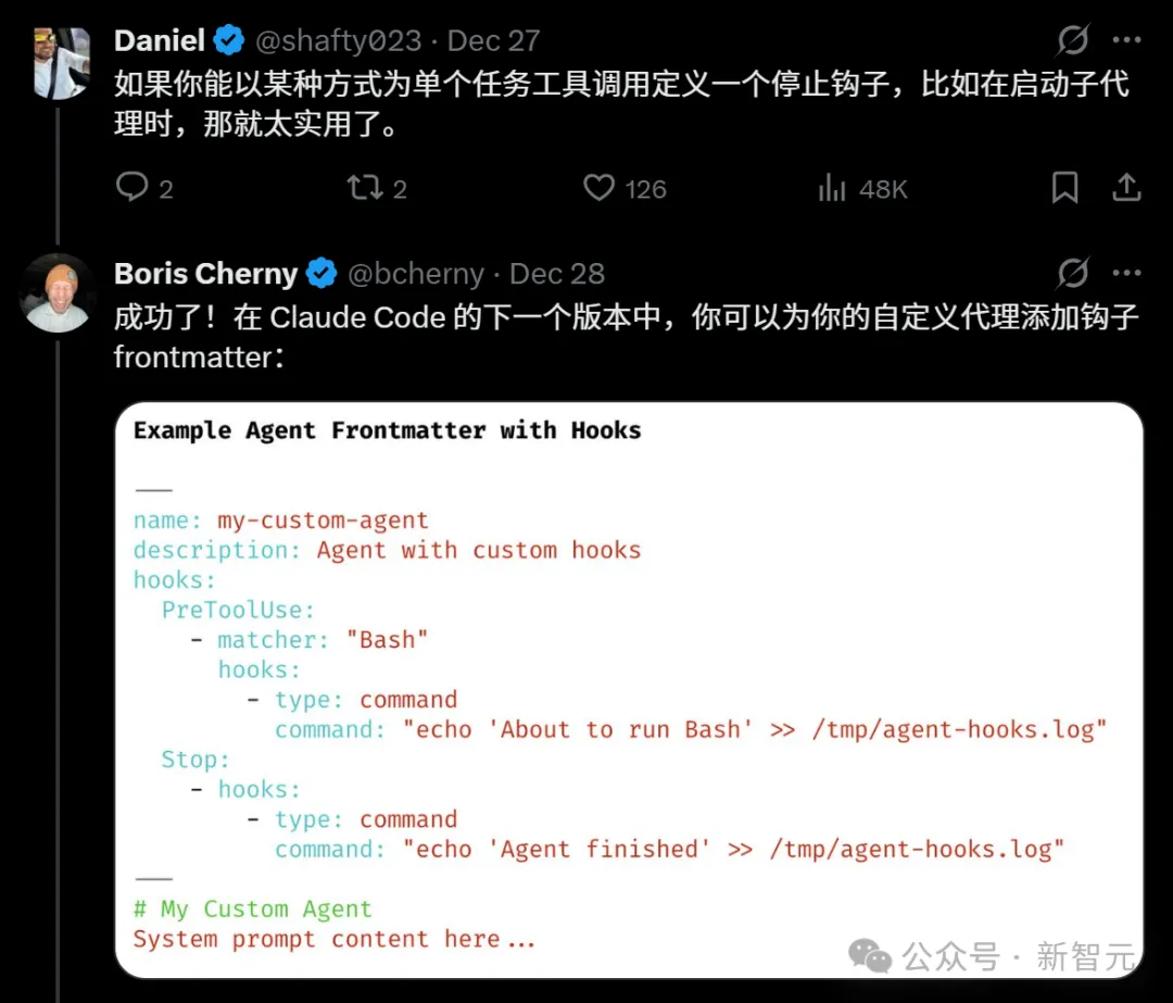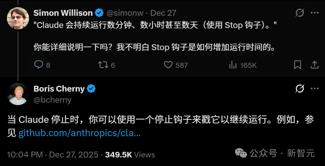 为什么Claude可以持续运行好几天?Boris解释道,当它停止时,可以使用一个停止钩子来「戳」它,让它继续运行。