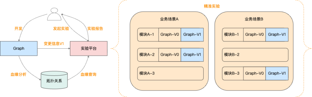Graph精准实验:用户以Graph为视角触发实验,系统基于血缘分析结果,精准定位需要实验的模块和业务场景,自动的进行相关实验构建、部署和流量接入。这一过程中用户只需要提供Graph及其变更信息,即可保证受影响的模块和业务场景都可以被验证到。