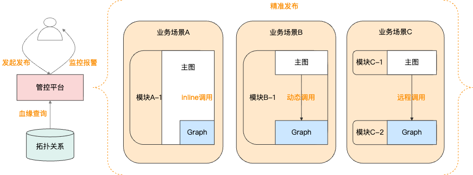 Graph精准发布:用户以Graph为视角触发生产变更,同样基于血缘分析结果,精准定位需要变更的模块和业务场景,并行进行多模块的生产变更。针对不同业务场景对Graph的差异化使用,我们对Graph发布流程进行了概念抽象,来满足这一诉求。
