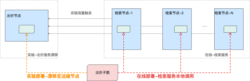 进一步地,针对出价实验在重数据模块(如检索节点)拉起资源成本高的挑战,我们利用图漂移能力,支持出价子图根据场景灵活切换部署位置:在线接流阶段部署于“本地”以追求极致性能;实验阶段则“漂移”至远端节点,以极低的部署成本实现快速迭代。