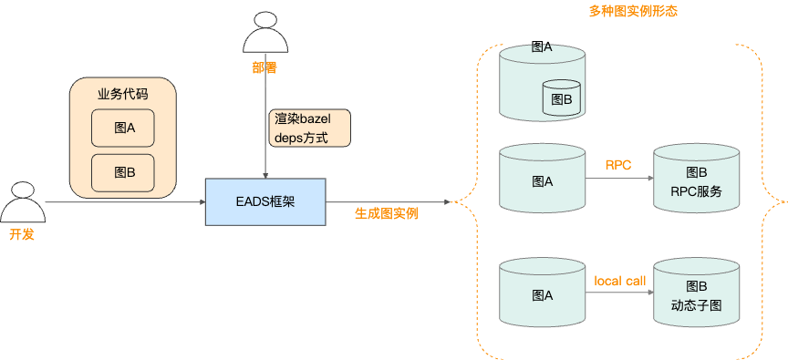 Graph编译:根据图编译脚本(bazel BUILD)描述的主图(A)调用依赖子图(B)的方式(inline/local/remote),完成主图A到子图B的实际编译部署物。这一过程可类比C++程序对第三方库的处理方式——根据需求选择静态依赖、动态依赖或RPC调用。