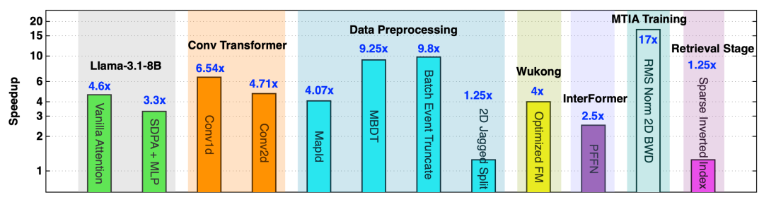 图6 展示了KernelEvolve在异构AI硬件上的卓越性能。相比传统方案,它在卷积 Transformer、数据预处理算子及推荐系统等Meta核心生产场景中,实现了1.25倍至17倍的加速。