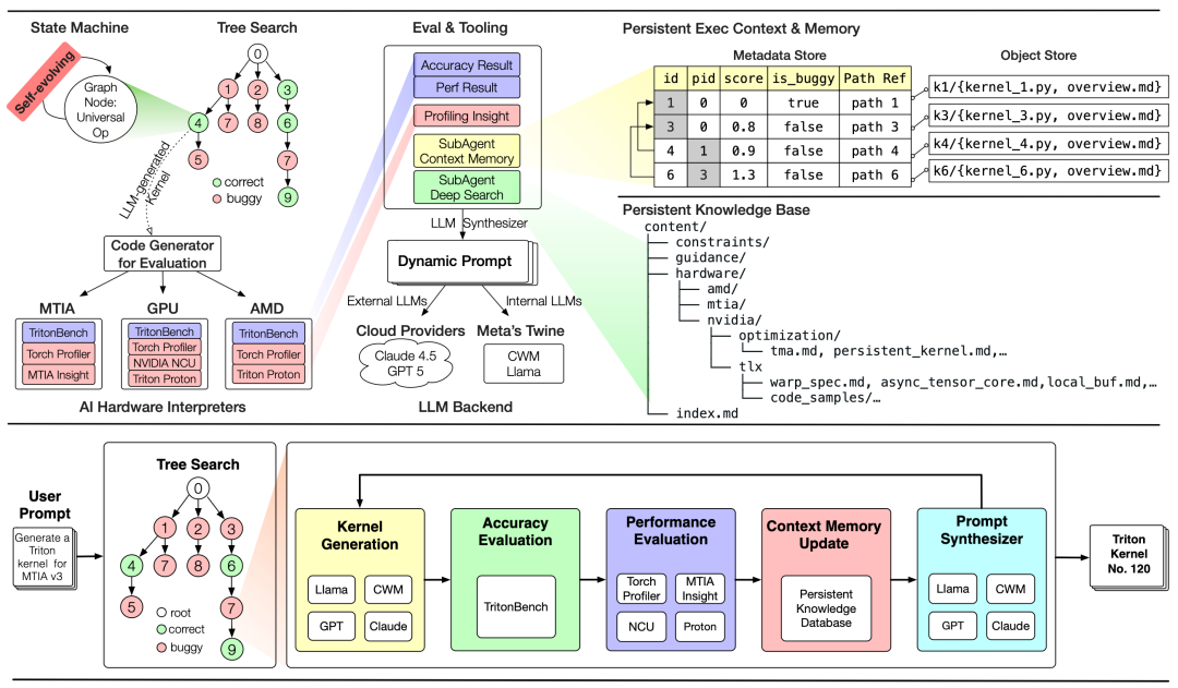 图4 展示了KernelEvolve的系统架构(上)与执行工作流(下)。该系统通过具备「自进化」能力的树搜索(Tree Search)状态机,协同子智能体、评估工具及AI硬件解释器(MTIA/GPU/AMD),利用Claude 4.5、GPT-5或Meta内部CWM等大模型后端动态生成Triton内核候选方案,并通过持久化知识库与元数据存储,实现内核优化的闭环探索与性能压榨。