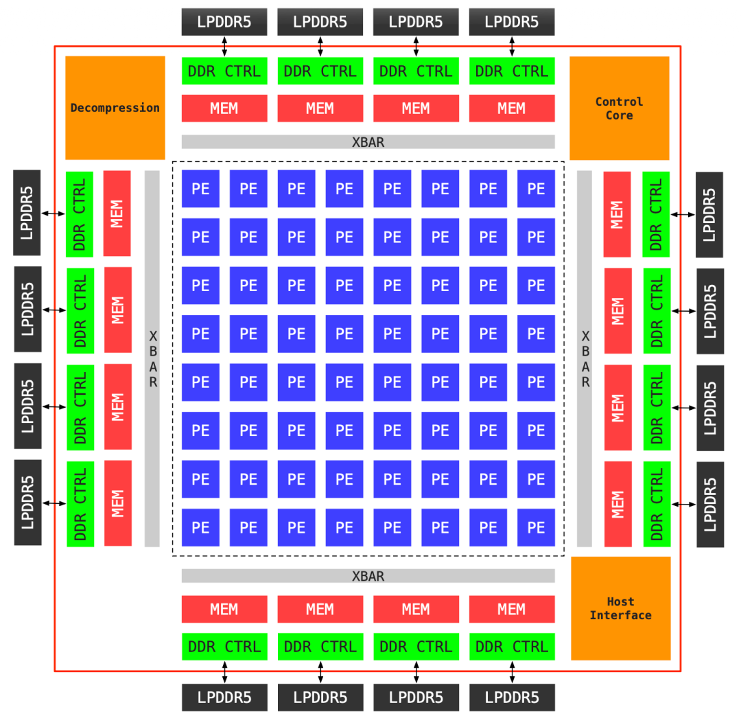 图 2 展示了MTIA 2i架构详情。其核心为8×8的处理单元(PE)阵列,通过片上网络互联。每个PE集成了双RISC-V内核及四大专用硬件引擎:用于数据转换的MLU、矩阵运算的DPE、聚合计算的RE和向量处理的SIMD,并由命令处理器(CP)统一调度。
