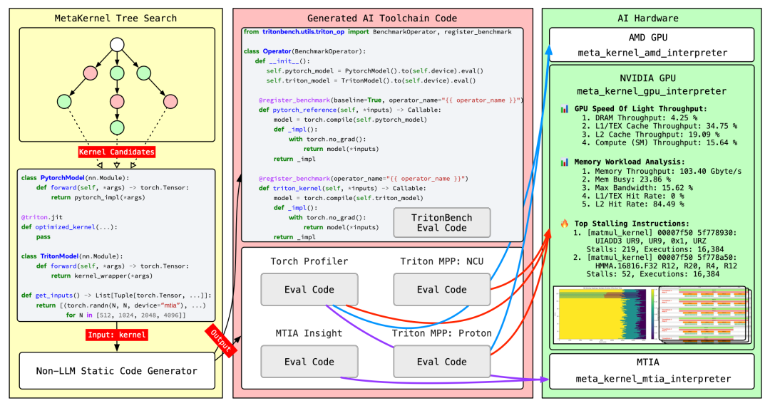 硬件解释器: 为NVIDIA、AMD和MTIA平台提供专门的执行环境,确保代码在真实硬件上的准确评估。