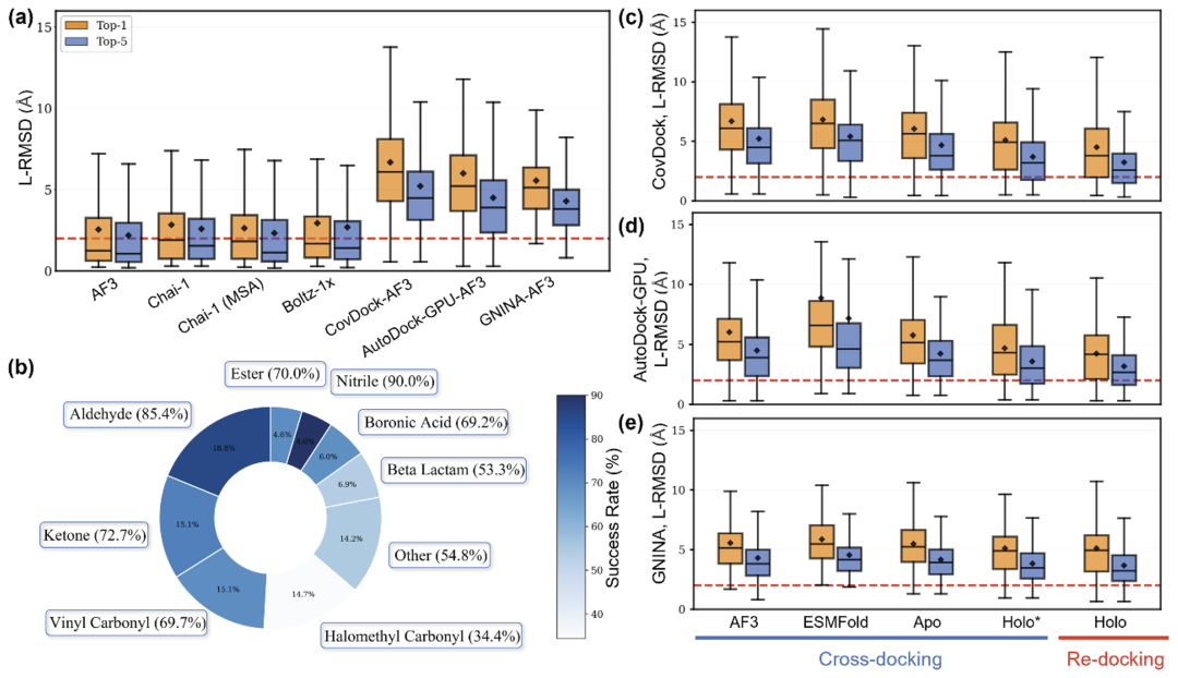 图1:(a), (c)-(e) 不同共折叠方法与经典对接方法在CoFD-Bench上的L-RMSD分布与成功率对比;(b) CoFD-Bench中配体共价头分布。