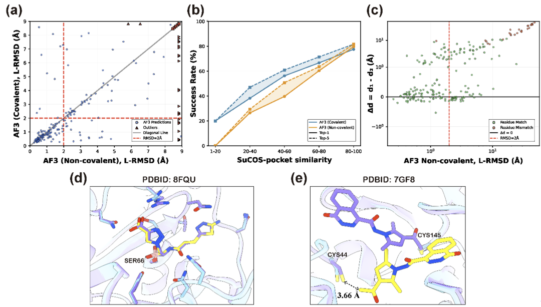 图4:基于AlphaFold 3的非共价与共价预测取得了相当的结果。(a)-(c) 两种方法在L-RMSD,成功率以及原子距离差分析;(d) AF3在无约束条件下成功复原8FQU的共价结合构象;(e) 在7GF8案例中,AF3虽然定错位点,但共价弹头指向了另一个亲核性半胱氨酸。