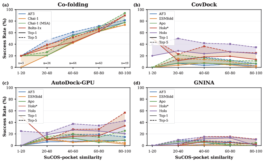 分析揭示了一个关键局限:即使共价键的形成减少了构象的自由度,但共折叠方法的性能仍然高度依赖于测试数据与训练数据的相似性。对于那些与训练集中结构相似度较高的体系,模型预测非常准确;但面对低相似度的新颖口袋-配体对的时候模型的预测成功率显著下降,经典对接方法则不受到这个的影响。