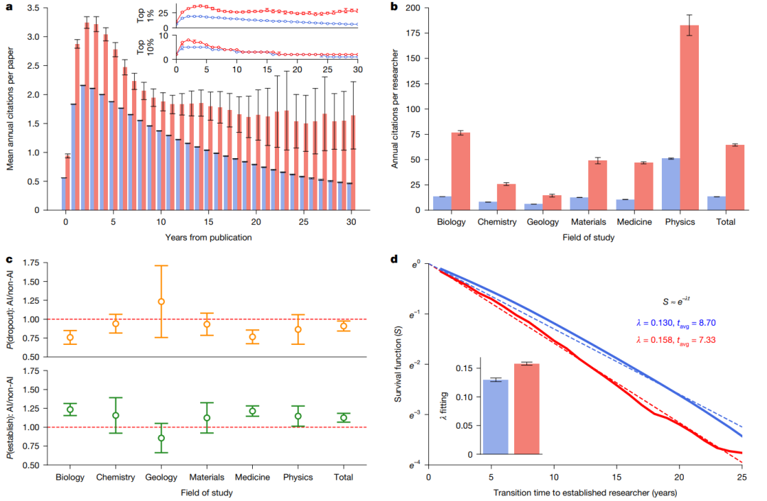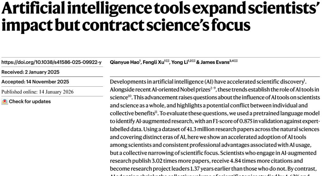 于是,团队向着这一问题出发了,并最终发表了《Artificial Intelligence Tools Expand Scientists’ Impact but Contract Science’s Focus》这篇论文。