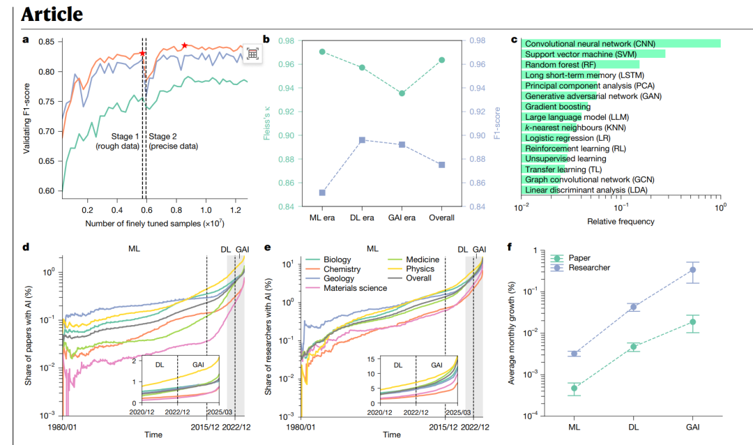 基于该数据集,团队系统性分析了AI在自然科学六大领域(生物、医学、化学、物理、材料科学和地质学)的影响。