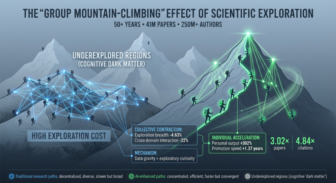 团队发现,AI的高效率产生了一种强大的“科学智能引力”效应。它引导研究者集体涌向少量适合AI研究的“热门山峰”,即那些已有大量数据、适合用现有AI方法快速出成果的研究方向。