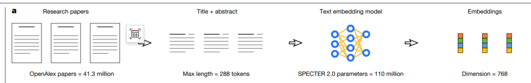 具体到第一步,他们把每篇论文中最能代表其内容的标题和摘要作为核心文本,通过一个深度嵌入表征模型转换成一个由768个数字组成的、固定长度的数学向量。