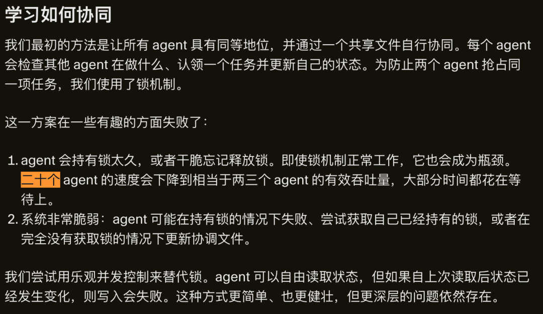 最初,他们尝试让所有Agent平等协作,通过共享文件来同步状态。结果发现: