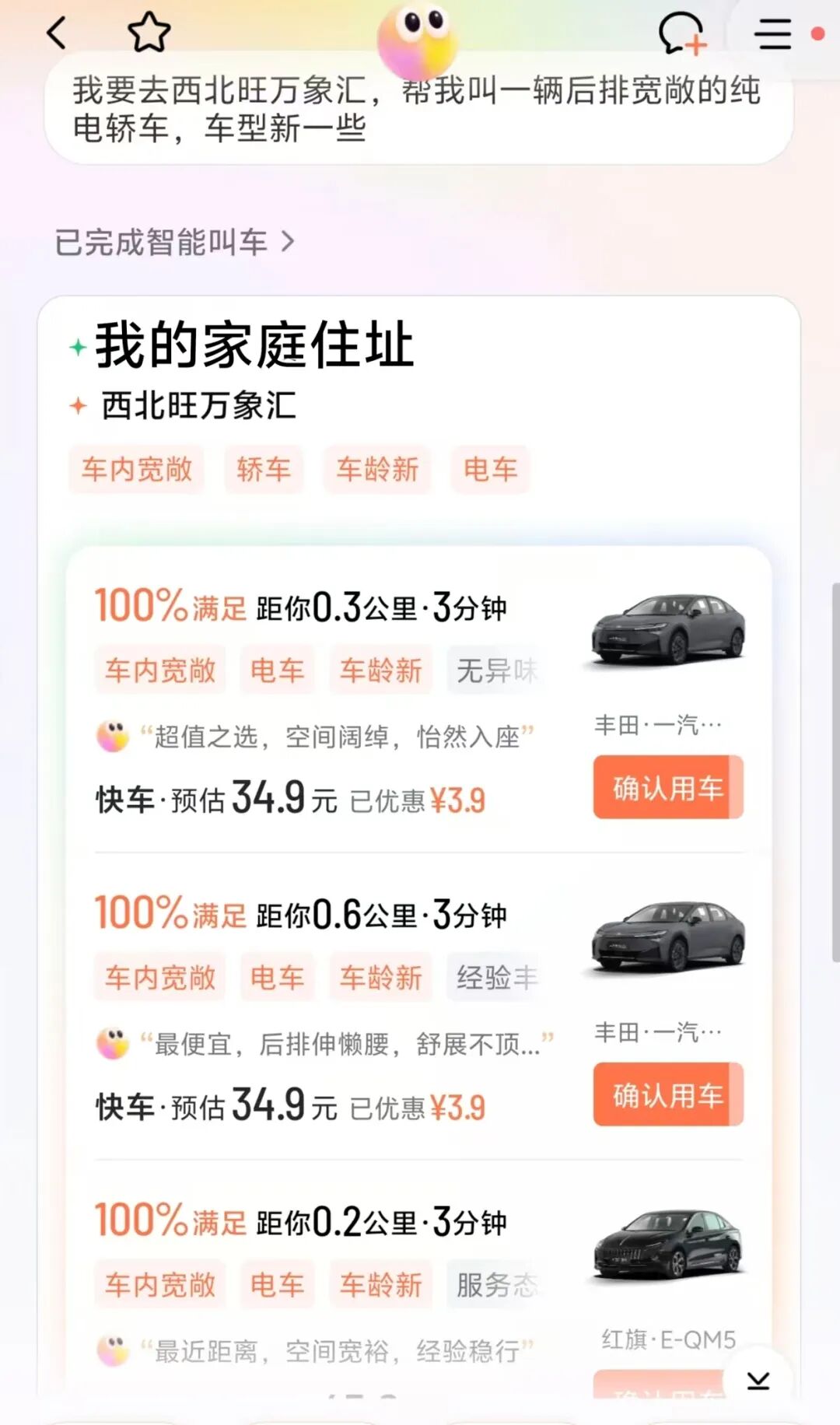 除了选择座位数量,车型选择上也可以更具体,比如让小滴帮我叫辆“后排宽敞的纯电轿车,车型新一些”,这一句话同时对空间、动力、车型和新旧程度提出了要求,小滴也都满足了。