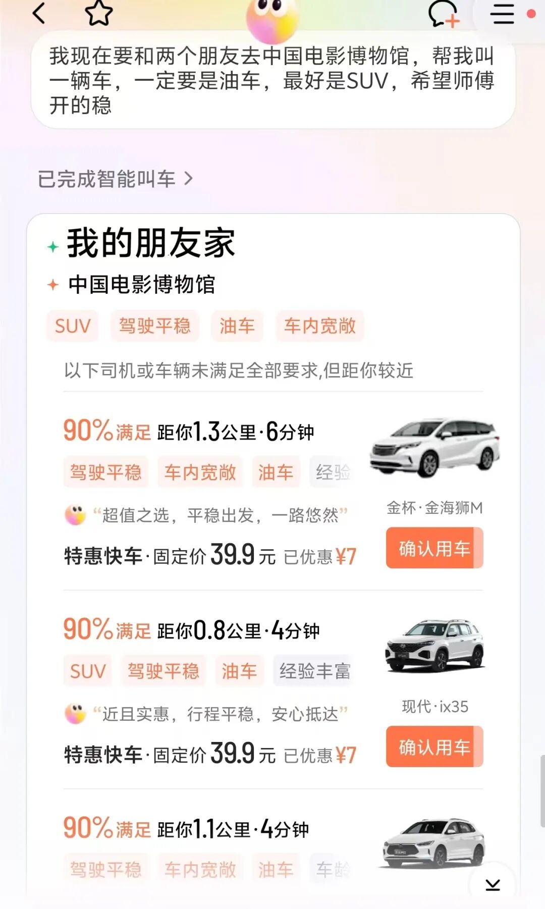 我想要坐SUV,就跟小滴说帮我叫一辆SUV,它就帮我匹配上了SUV车型,车里空间更宽敞一些。