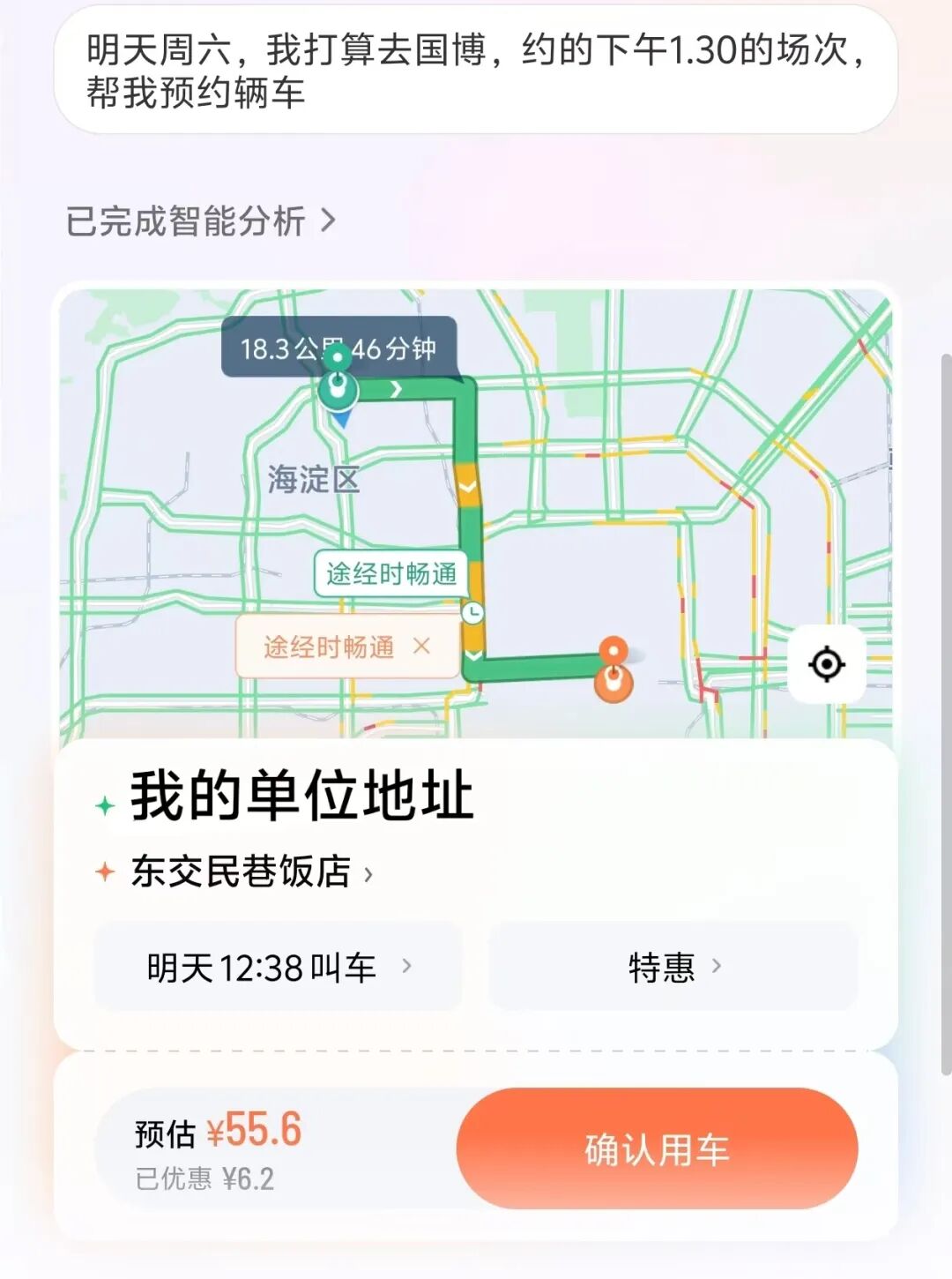 比如我预约了国家博物馆周六下午一点半场次,就跟小滴说“我要去国博”,它就会按照距离,算好叫车时间。