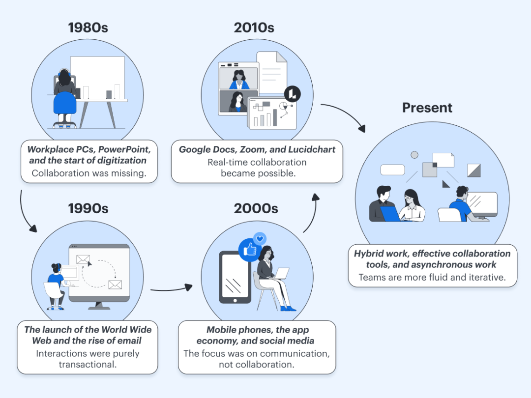 第一阶段,协作是「电子文档」的流转,Word、Excel、邮件等通过传输,多人通过异步完成任务。
