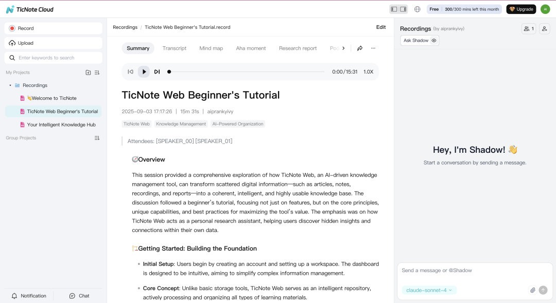 通过硬件TicNote Pods/Watch,直接上传会议录音,Shadow AI自动转写、总结、提取行动项,所有人实时可见。