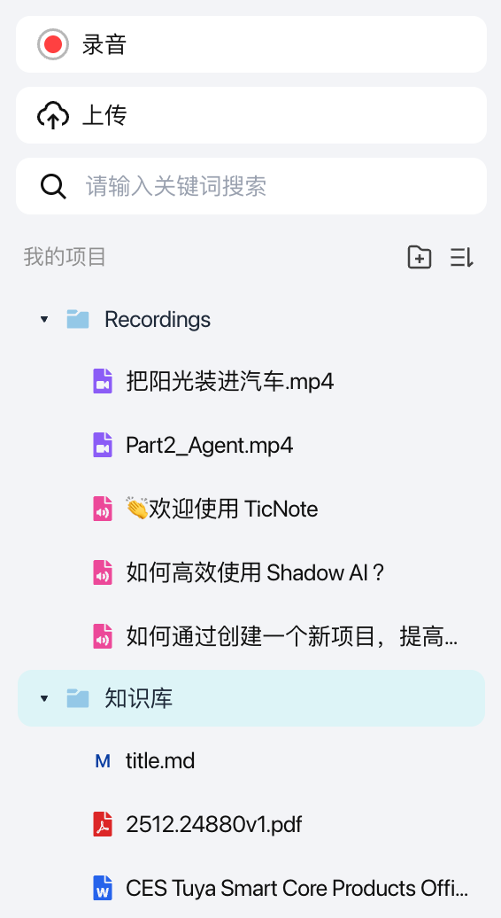 左侧项目栏:集中管理所有录音、文档与AI产出;